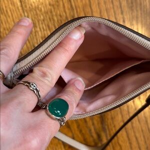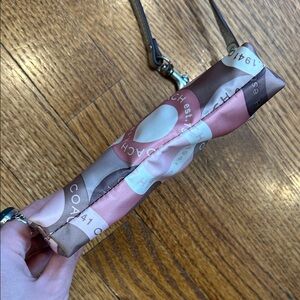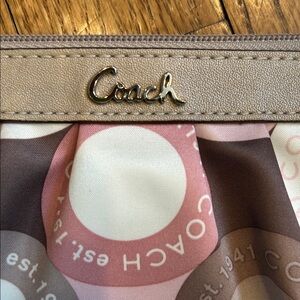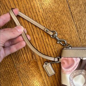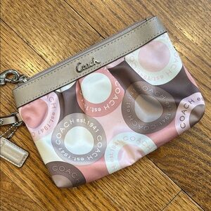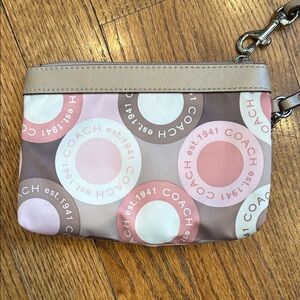 Chic Coach wristlet with a playful circle design. With zipper closure, leather strap, stamped Coach tag, and slot specifically for cards inside.