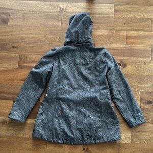 Elegant gray jacket with a hood. Features zip closure and side pockets. Perfect for cool weather.