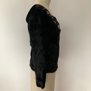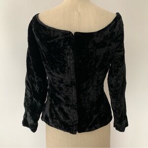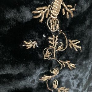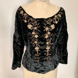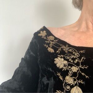 Black velvet with metallic thread embroidery. A small size with a very wide neckline. Close to off the shoulder on me. There are stays at the front bust. Bottom button missing on each sleeve. Some missing embroidery in a few areas (last 2 photos) Zippered back. Neckline opening laid flat is 19”, 16” under armholes, 18” sleeve, 19” length.