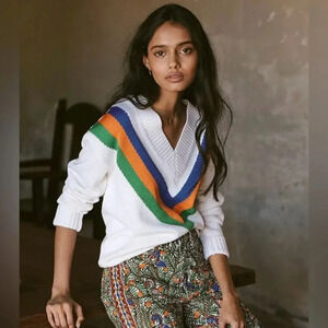 Tory Burch Colorful Striped Merino Wool V Neck Colorful Sweater- XXS