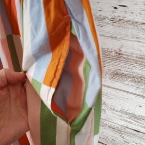 St. John's Bay women's short sleeve maxi dress. It features a colorful striped and block print pattern, a smocked bodice, and ruffled cap sleeves.