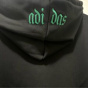 Stylish black Adidas hoodie with striking white spider design. Features bold yellow flame accents and classic three-stripe sleeves. Brand New With Tags.