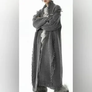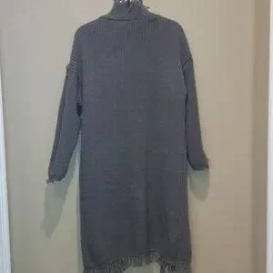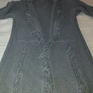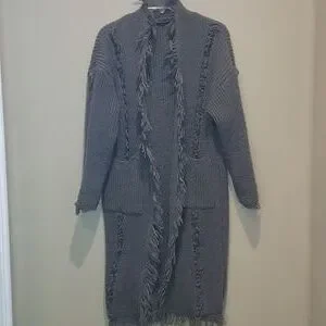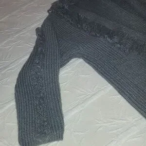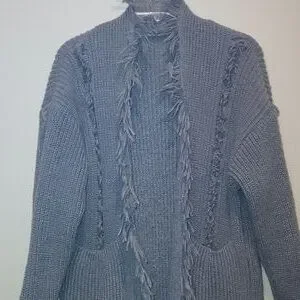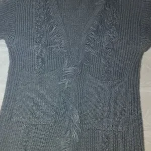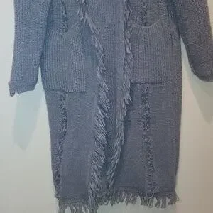 Size Large / XL. Grey. Chunky cable knit cardigan. 2 front pockets. Tassel frayed hems. Gorgeous fun piece. Collard. Pit to pit 22" with stretch. Arm length from pit 16". Length approximately 38.5".