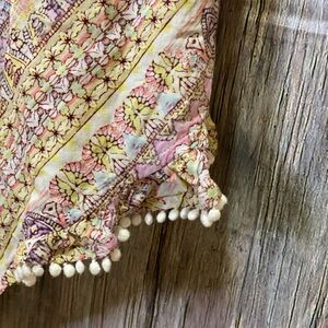 Boho style romper. Pastels. Size small. White tassel-tie at waist. Detailing on bottom of shorts.