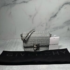 Brand new authentic Givenchy Mini 4G Jacquard Chain Bag in a striking silver metallic finish. Crafted in Givenchy’s iconic 4G jacquard fabric, this mini bag features the signature 4G logo clasp and a sleek chain strap for shoulder or crossbody wear.