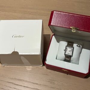 Stylish Cartier watch with a sleek silver face. Includes all the links.