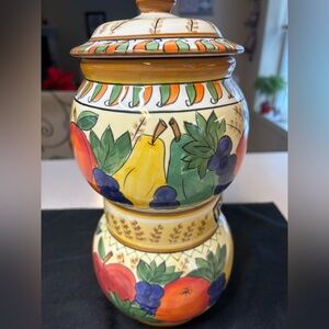 Hand-painted jar featuring red apples, orange oranges, and blue grapes. Perfect for storing biscotti.