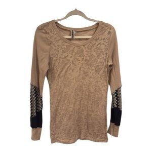 BKE beige patterned long sleeve top in used – great condition. Women’s size large. Features a beige lace body perfect for layering, with black, white, and beige chevron-patterned sleeves for a stylish contrast. Lightweight and versatile for casual or dressed-up outfits.