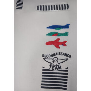 Vintage 80s Reconnaissance Team Adult Large Sweatshirt 1/2 Button White Long Sleeve Henley Pocket Graphic Print With 3D Paint Airplanes Black & White Striped Button Track & Pocket Trim Lightweight Cotton Blend Weighs 12ozs