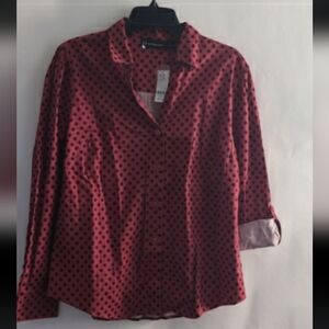 Stylish red blouse with black polka dots from New York & Company. Perfect for any occasion.
