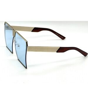 Statement sunglasses offering a bold, modern look. These feature an oversized square shape with a flat top design and eye-catching mirrored lenses. The sleek metal frame adds a touch of sophistication, while the unique shield style provides ample coverage and a distinctive edge. Perfect for making a statement at festivals, beach outings, or stylish city adventures.