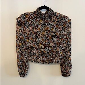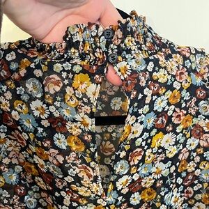Chic blouse with vibrant floral design. Features stylish ruffles. Perfect for any occasion.