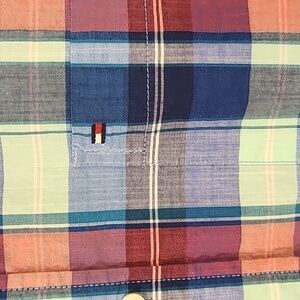 TOMMY HILFIGER Men's Plaid Short Sleeve Orange-Red/Blue/Green Button-Up Shirt, size XL. Front pocket with small logo. Gently pre-owned.