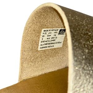 Platform slide sandals featuring Reef’s Cushion Vista Hi construction with a supportive, lightweight feel and elevated profile. Dual metallic straps present a warm golden tone with a soft shimmer finish, paired with a contoured footbed for all-day comfort. Layered platform sole adds height without excess weight while maintaining stability and flexibility underfoot. Cushioned EVA footbed and textured outsole support casual, resort-ready wear with a clean, modern silhouette. Designed as an easy slip-on style with Reef branding at the straps and footbed.