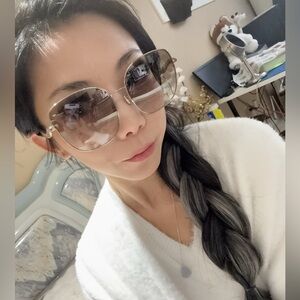 Elegant square sunglasses with pink gradient lenses. Gold metal frame. Stylish and chic design. Ready for something new