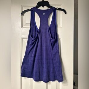 Athleta Chi Racerback Tank in blue with shadow stripe detailing. Vented synthetic fabric for moisture wicking.