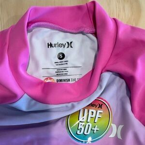 Stylish pink rashguard set by Hurley. Features gradient design. Offers excellent sun protection. Ideal for beach or pool fun.