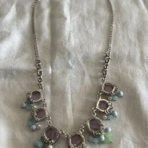 Playful pastel statement necklace featuring soft lavender cat’s eye cabochon stones with a beautiful striped shimmer that shifts gently in the light. Each lavender stone is accented with delicate clusters of mint green, baby blue, and pearl-style beads that dangle below the settings, creating movement and a cheerful pop of spring color. The silver tone chain and metal settings balance the soft pastel palette while keeping the design lightweight and comfortable for everyday wear. Perfect for pairing with sweaters, blouses, dresses, or adding a soft feminine touch to casual outfits. Faux cat’s eye cabochon stones with faux pearl and acrylic accent beads and silver tone metal chain.