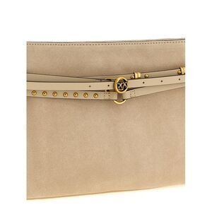 'Belt' suede medium shoulder bag with two-bellows construction, smooth leather belt detail with removable metal studs and 'Love Birds Diamond Cut' logo, top zip closure, adjustable and removable handle.
