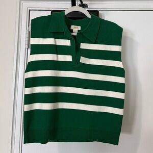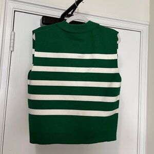 Stylish sleeveless top with bold green and white stripes. Features a classic collar and V-neckline.