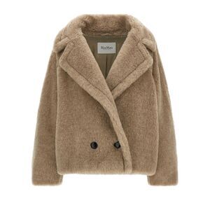 'MxmCambusa' short coat in alpaca and cashmere Teddy fabric on a silk base, double-breasted style with front button closure, wide lapel collar, pockets, wide long raglan sleeves, Monogram jacquard fabric lining.