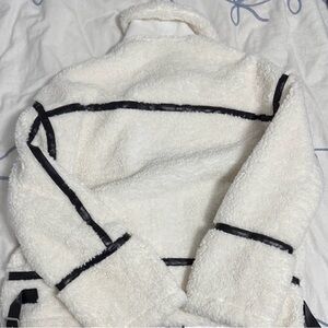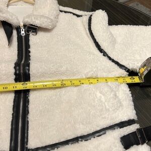 Stay cozy and stylish with this chic white sherpa jacket featuring sleek black accents. Zipper closure. Adjustable bottom buckles. Faux blk leather trim. Perfect for layering in cooler weather. 100% Polyester. Pristine condition. NWOT Retail $109