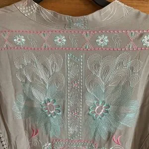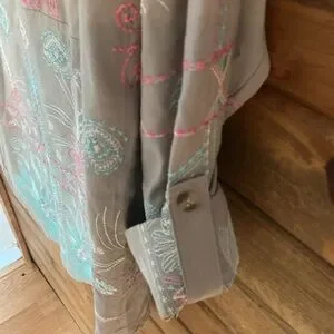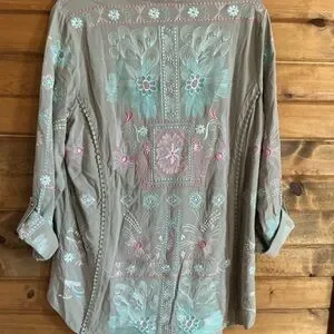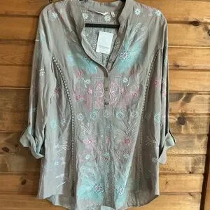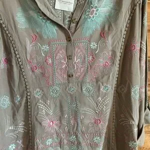 Soft Surroundings Gray Blouse with Pink and Blue Embroidery