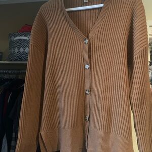 Chic camel cardigan with button front. Ribbed texture for added style. Ideal for layering.