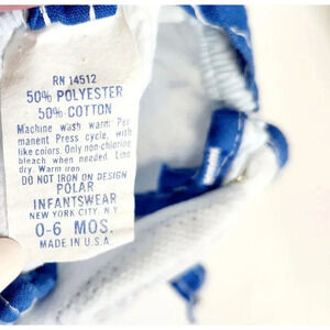 This vintage Polar Infantswear romper is a must-have for any little boy's wardrobe. The blue polyester material is soft and comfortable, perfect for those summer days. The sleeveless design and size of 0-6 months make it a great choice for young boys.