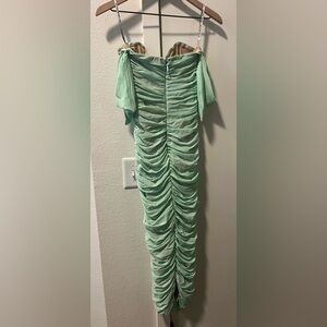 Semi-sheer stretch mesh, off the shoulder draped sleeves, completely ruched details throughout, fully with a invisible zipper at the center back, built in padded cup, and small slit in back.