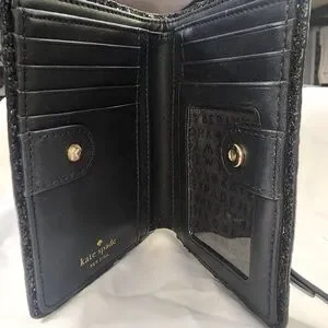 Elegant black wallet by Kate Spade. Features a sleek design with gold logo detailing. Sparkly around the edges.