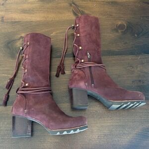 Stylish and versatile Sorel burgundy suede boots, perfect for adding a touch of sophistication to any outfit. These eye-catching boots feature a unique lace-up design with bronze-tone hardware, a convenient side zipper for easy on and off, and a stacked block heel for a comfortable lift. Decorative tassels add a playful, bohemian-inspired touch. Ideal for casual outings, weekend adventures, or adding a stylish edge to everyday wear, these Sorel boots are sure to make a statement. In used condition with wear/imperfections shown in last 2 photos.