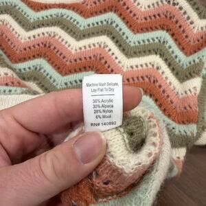 The Marine Layer Ruby Sweater in Rainbow Chevron is a stylish and versatile piece made from a blend of alpaca wool, nylon, wool, and acrylic. This open-knit sweater features a colorful rainbow chevron pattern, long sleeves, and a crew neckline. Perfect for travel, casual outings, or business meetings, this pullover sweater is easy to care for with machine washing capabilities. The regular fit and size S make it a comfortable and fashionable choice for the winter, fall, or spring seasons. Add a pop of color and a touch of bohemian flair to your wardrobe with this unique and classic sweater from Marine Layer.