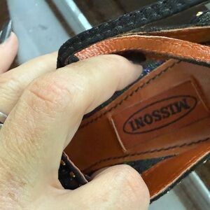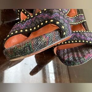 Elegant Missoni sandals with a vibrant multicolor pattern. Features black straps with gold stud accents. Perfect for adding flair to any outfit. Dust bag.