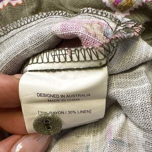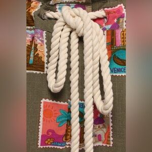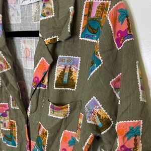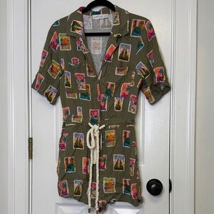 Fun and breezy romper from Petal + Pup, new without tags. Features a playful postcard stamp print on an olive green base with short sleeves, collared neckline, and rope tie belt for an adjustable fit. Lightweight and breathable rayon-linen blend makes it perfect for warm weather, vacations, and casual outings.