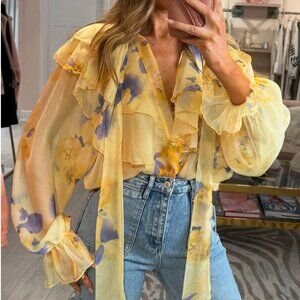 Elevate your casual look with this yellow button-down shirt, featuring a ruffled ditsy floral motif and a layered design accented by pearl details. A tie-neck front adds a touch of charm, while flare sleeves bring breezy movement. The loose fit and regular hem provide comfortable, everyday wear, making it a versatile piece for relaxed outings and effortless style.