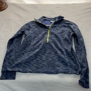 Columbia pullover with a blue knit design. Features a yellow accent stripe. Ideal for layering.