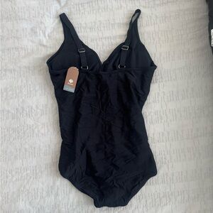 Flattering Smismivo black one-piece swimsuit designed for comfort, support, and a slimming fit. Features a cross-ruched front that smooths the waist and midsection while offering great bust support.