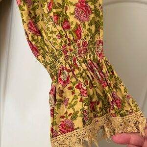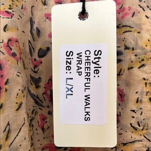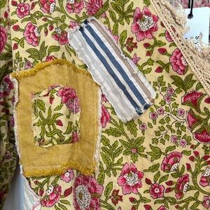 Colorful floral patchwork wrap top with fringe details. Features a mix of vibrant patterns.