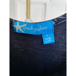 Fresh Produce navy leaf print midi dress made in the USA from 100 percent cotton with a scoop neckline and easy slip on silhouette. Lightweight breathable fabric with a softly flared hem designed for warm weather comfort and movement.