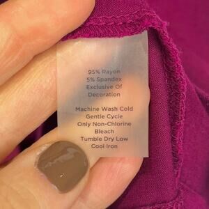 V-neckline with tie, short raglan sleeves, pullover style, hip length. Stretch rayon jersey knit in magenta reddish-purple with crepe neckline / tie.