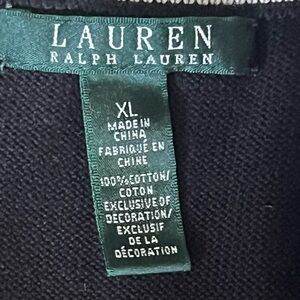 Lauren Ralph Lauren Quarter-zip pullover with a mock neck. Bold color-block (Red/Black/White) with an embroidered "RL" crest patch on the sleeve. 100% Cotton (soft, breathable knit).