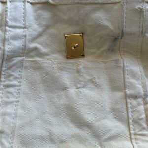 This distressed tote has been customized with birkin style gold hardware, a cargo strap that runs thru raw edge cuts