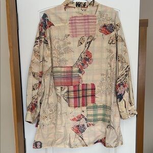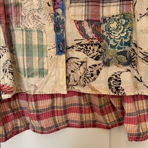 A Rare Bird Patchwork Button-Up Shirt with button cuffs high/low and patches