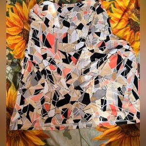 Stylish geometric print top. Features a mix of black, beige, and coral colors. Perfect for casual wear.