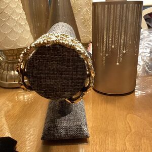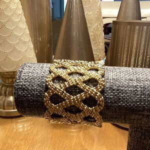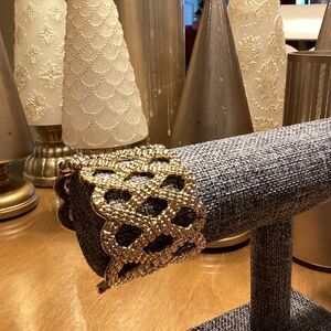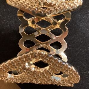 Fantastic goldtone finish is smooth on the inside and features granulated beading all over the outside. From Lilly Pulitzer brand, so it’s the quality you would expect. Wide - 3”. Heavy weight. Open cuff bangle has scalloped edges. Inside diameter of 2 1/4”. Will fit up through and including a 7 1/2” wrist.