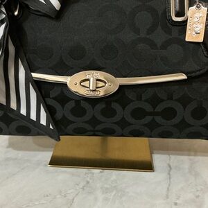 Coach Madison Op Art Satchel. This style was released as part of the Coach Madison collection, which features the brand's signature "Op Art" (Optical Art) C pattern in a sateen fabric with leather trim. The hardware is silver-toned and includes a turn-lock closure on an exterior flap pocket and a zipper closure for the main compartment. Bag scarf included, In excellent used conditions. Please bid responsibly no cancellations no returns
