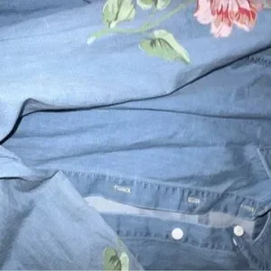 This an absolutely amazing denim button up to by Lauren Moshi…Cool graphic designs of flowers and a hue eye on the back…Size S runs true to size in my opinion as it’s slightly more form fitting although not overly so…Great condition!