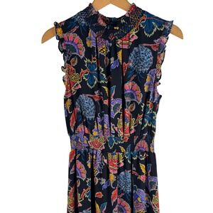 J. Crew midi dress showcasing a vibrant floral print on a black background. This sleeveless dress features a flattering mock neckline with intricate smocking and delicate ruffle trim along the armholes. The bodice transitions into a smocked waistband, creating a defined silhouette that flows into a tiered midi skirt.