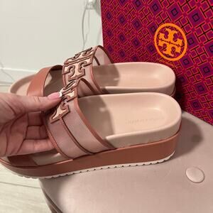 NEW Tory Burch Seashell Pink Ines Platform Slides Size 9.5. New in box NIB. Two-toned seashell pink color. Logo stamp detail. Heel is approximately 1". Leather and silk suede material.